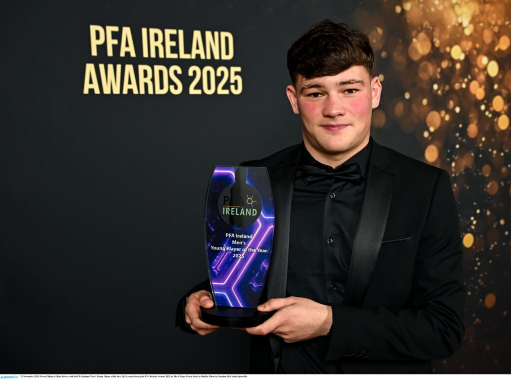 Owen Elding capped off what has been a wonderful 2025 for the Sligo Rovers striker by scooping the PFAI Men’s Young Player of the Year award for this year, the first Rovers player to win such an award in 38 years.