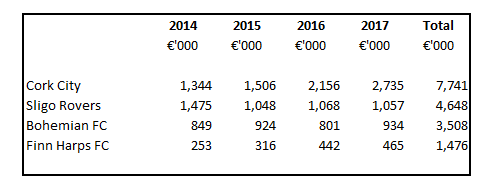 Sligo Rovers have obviously managed their costs well in the 4 years with a break even position. Their main cost as with all clubs is players and Sligo Rovers have cut that Budget from (€733k) in 2014 to (€546k) in 2017. They have now in affect adapted to not having the European money and cut their cloth accordingly but now struggle to get back to Europe. In comparison Cork City have increased their playing budget from (€669k) in 2015 to (€894k) in 2017 and now spend 64% more than Sligo on the players/managers wages which obviously gives them a big advantage.